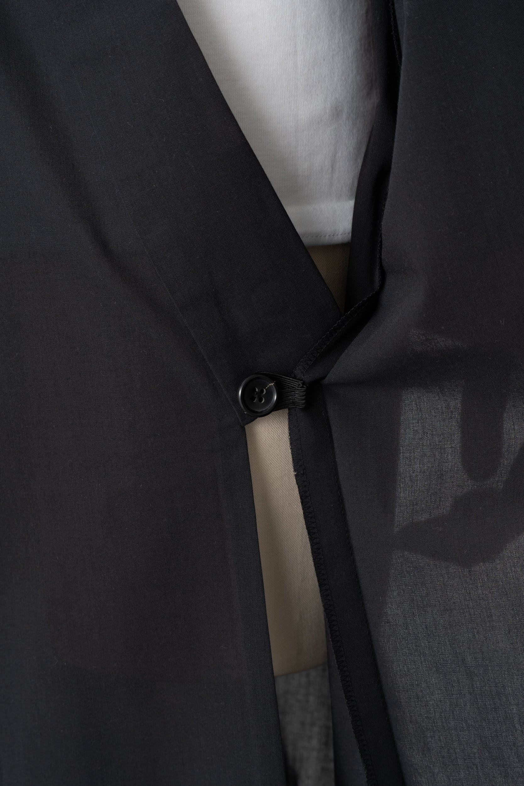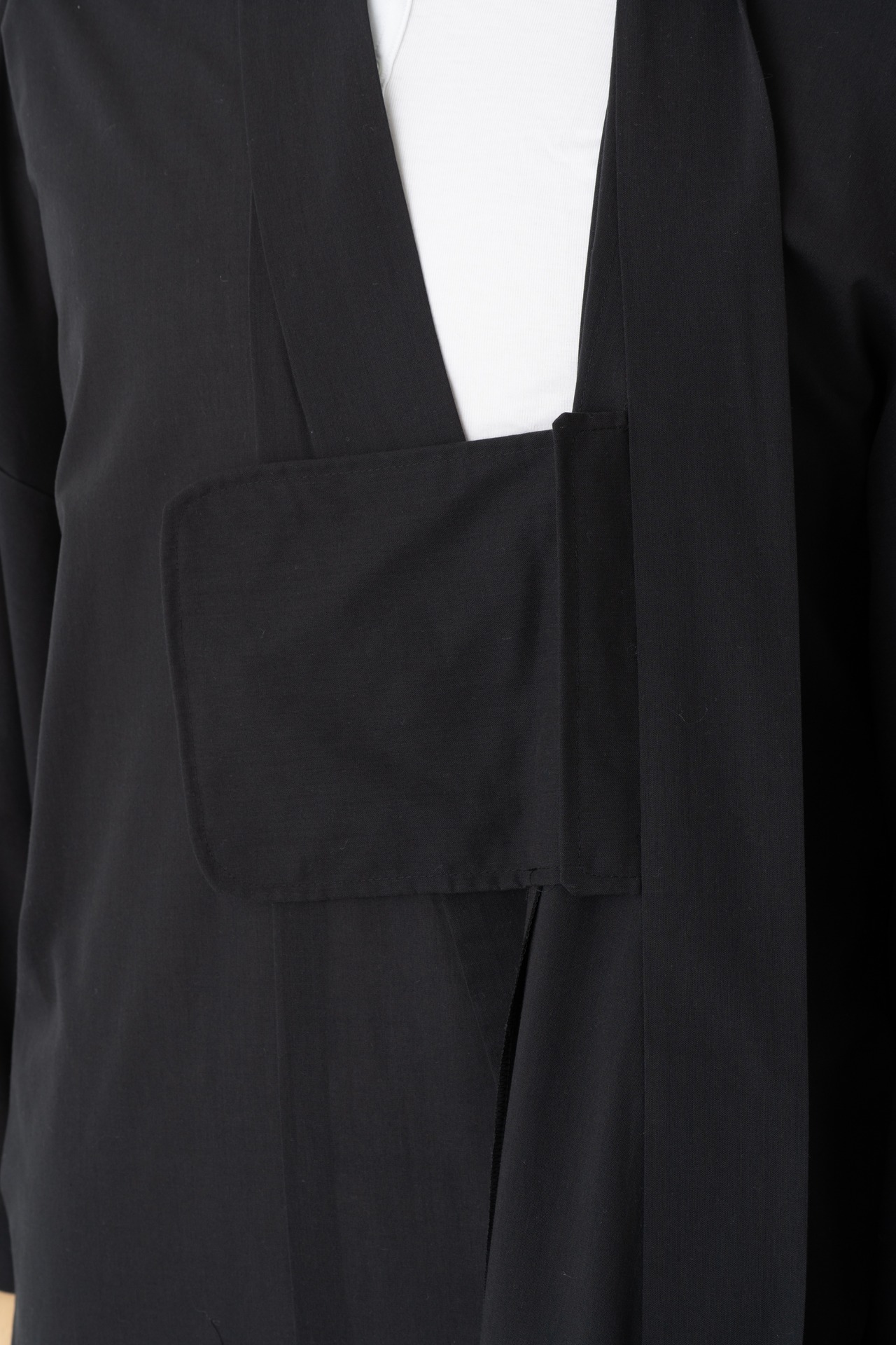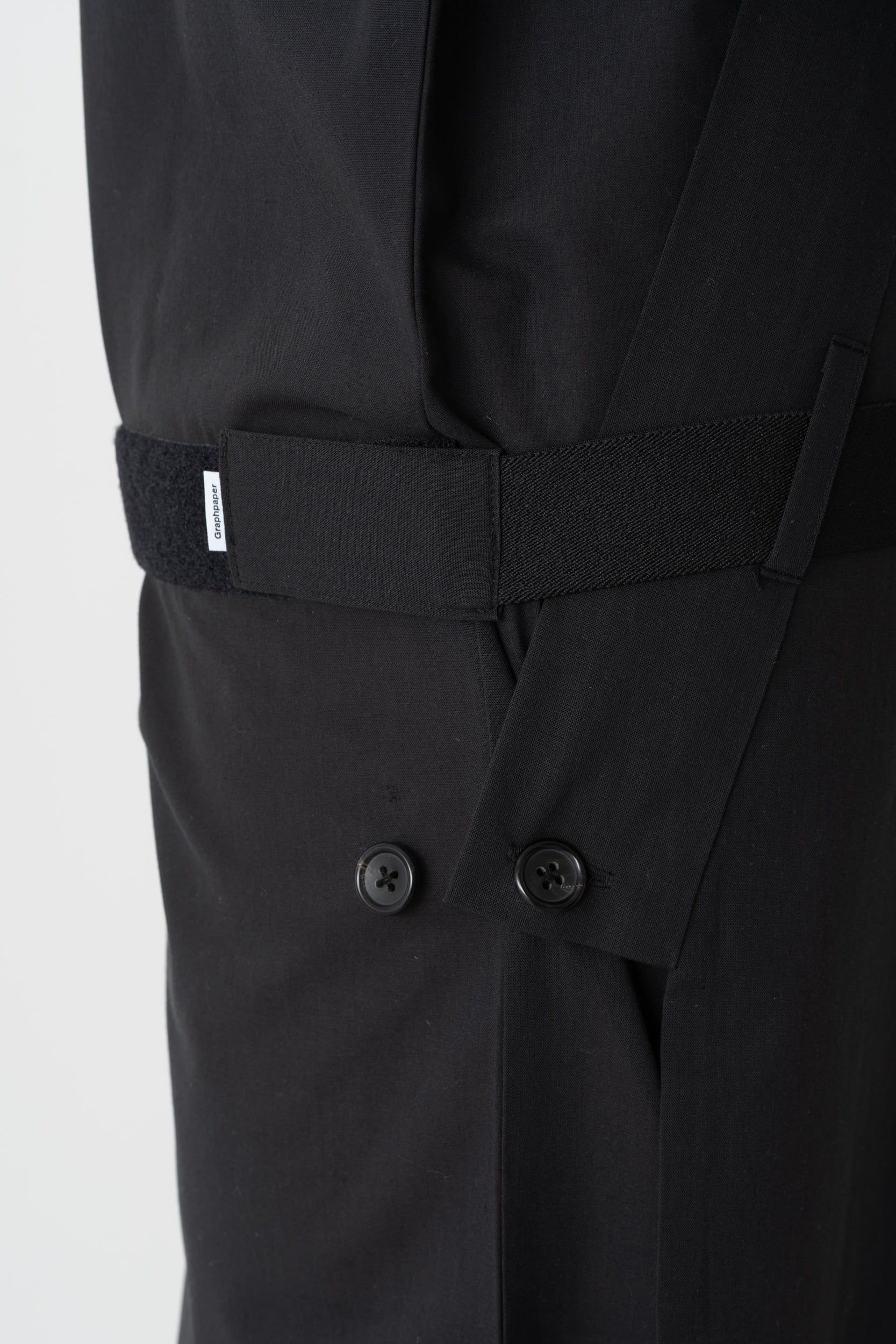 Graphpaper が得意とするサイズの概念をなくすように考えられたパンツのディテールを活かし、着用時の手間や帯そのものを省くことで着やすさと快適な着心地を実現しました。実際の仕様はボタンと内ゴムで前合わせを整え、Graphpaper のシェフパンツに使用されるベルクロとゴムで留めるだけで着用できる、帯要らずに仕上げています。