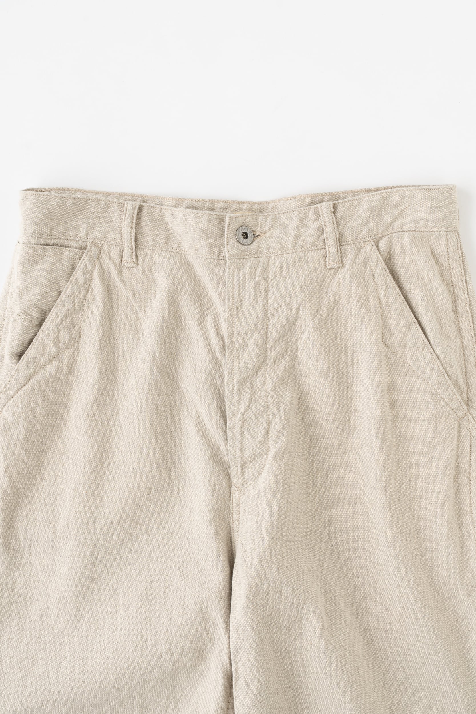 生地はリネンとコットンを使用したオックス織のため、適度なハリと柔らかさがあるのが特徴です。さらに、生地をじっくり揉み洗いしており、洗いざらした古着のような表情に仕上げています。