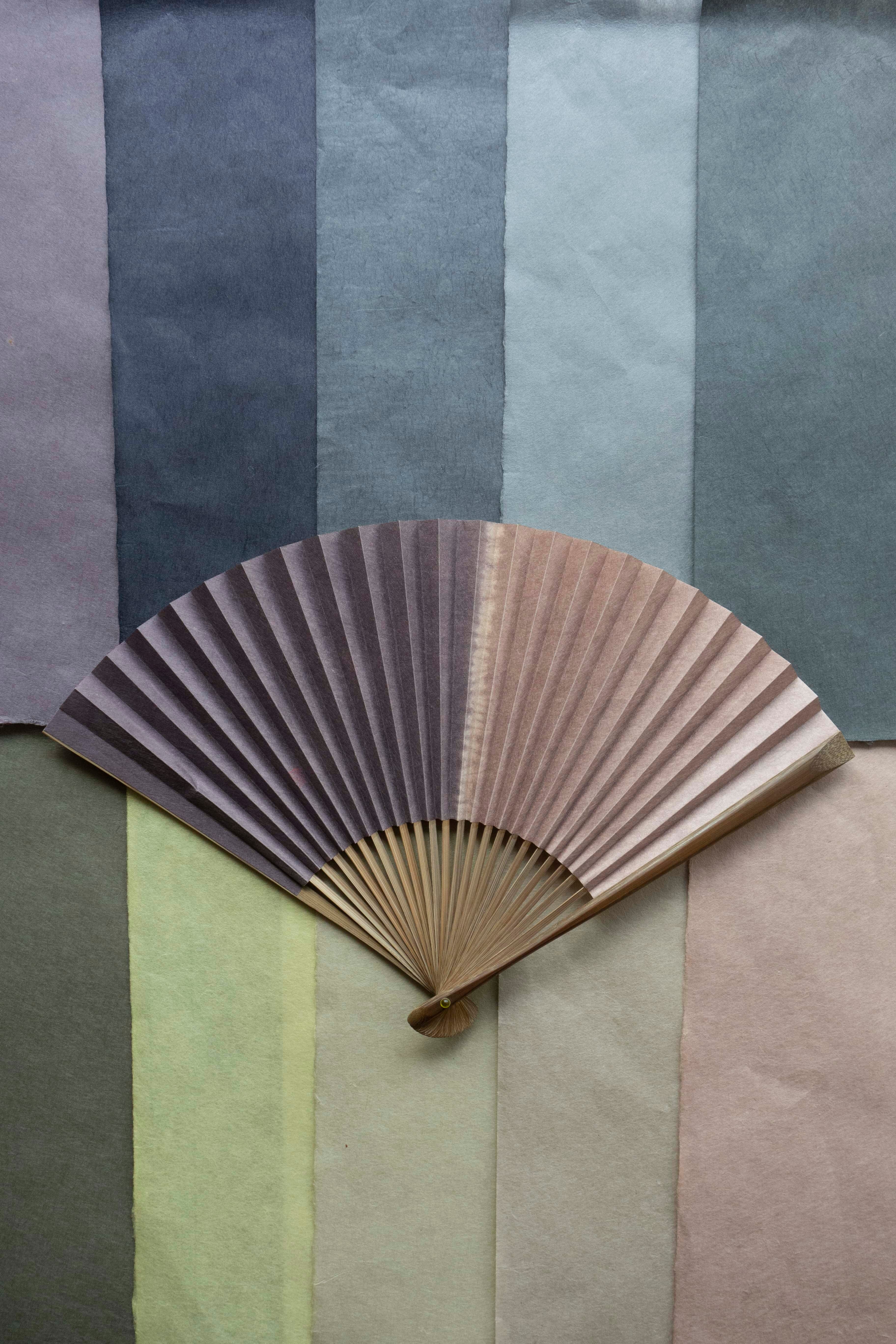 この扇子は、楮の手漉和紙を一枚一枚、柄に合わせて折ったり、絞ったりして草木(植物染料)で染色したこだわりの扇子です。