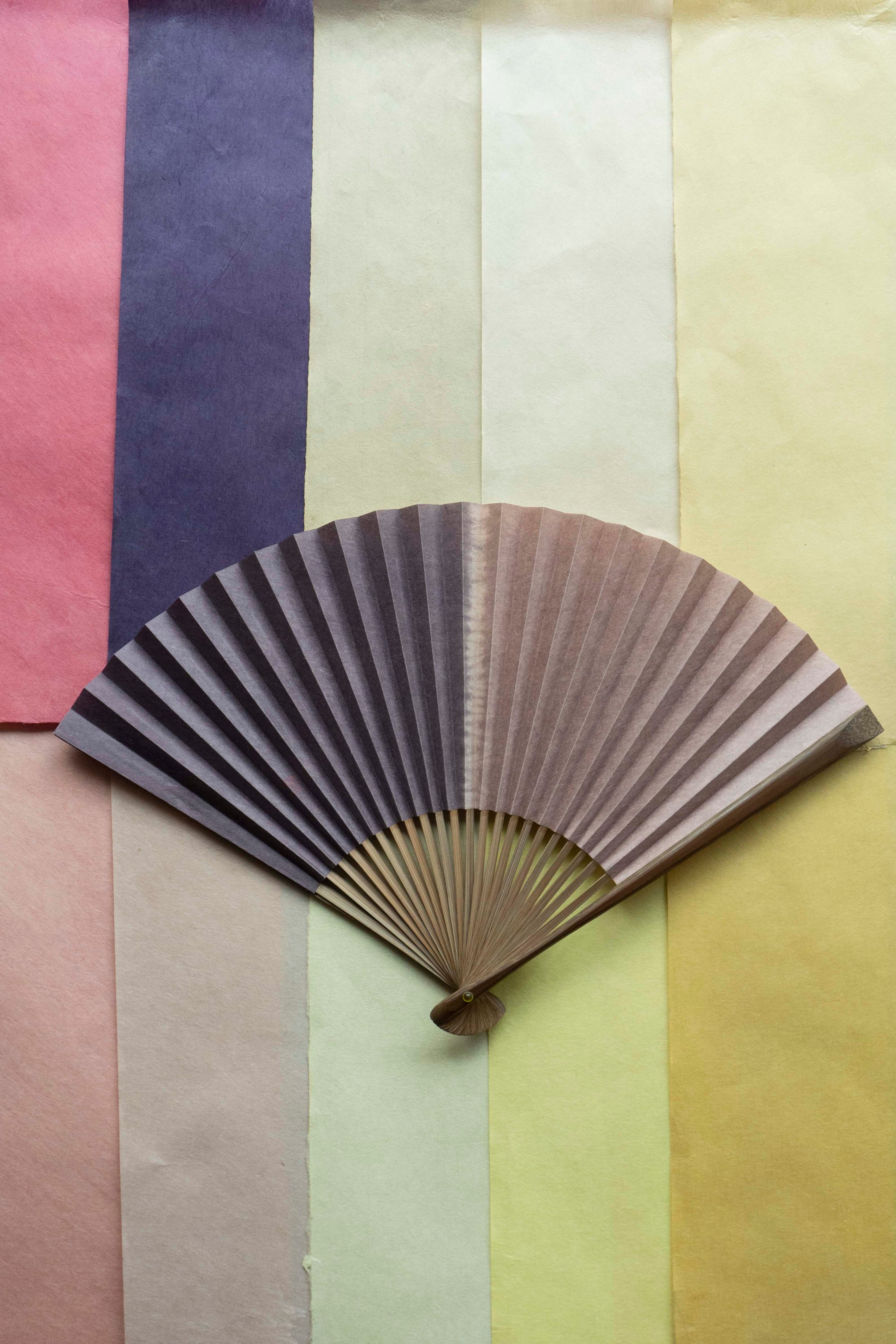 この扇子は、楮の手漉和紙を一枚一枚、柄に合わせて折ったり、絞ったりして草木(植物染料)で染色したこだわりの扇子です。