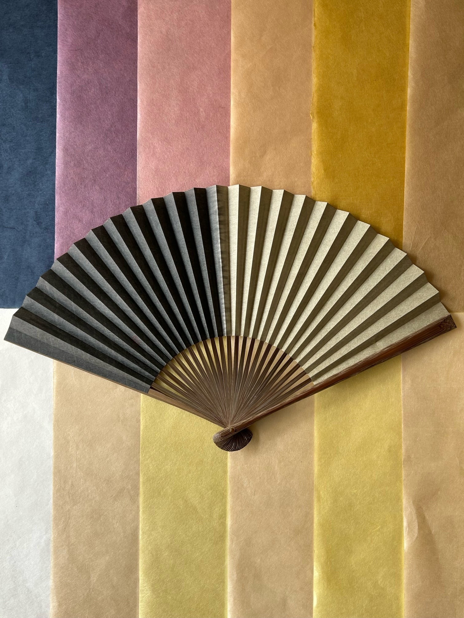この扇子は、楮の手漉和紙を一枚一枚、柄に合わせて折ったり、絞ったりして草木(植物染料)で染色したこだわりの扇子です。